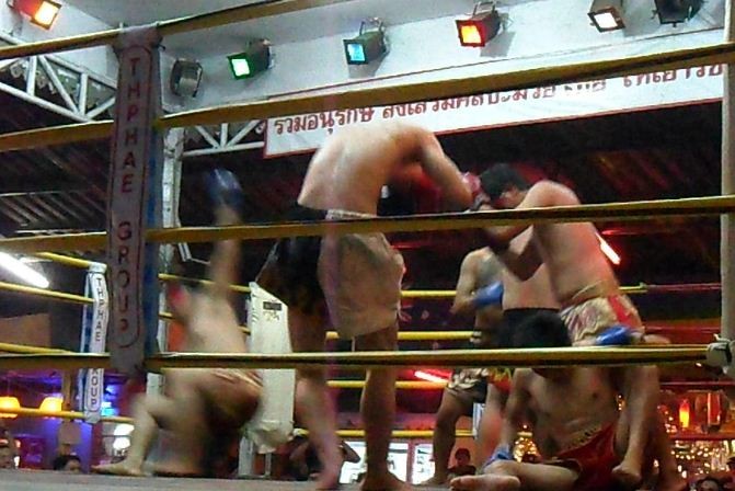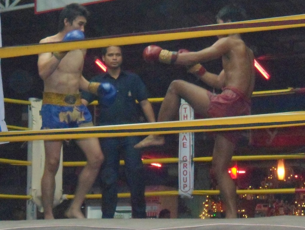 For an evenings entertainment we went to the international boxing stadium to watch some Thai Boxing. What we didn’t know was there were a couple of the bouts were between kids who were under 10! Bit weird watching them fight, but the ref had them under control. There was also a round with 8 blind-folded boxers which was a good laugh, as they just hit anything they found – including the ref! There were a few real bouts though which were very interesting to watch – Thai Boxing is a bit “dancy” and as well as punching aka UK style, and the boxers are allowed to use their feet too. The heavier weight fights were quite impressive and it was clear both parties were trying to win!