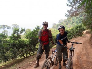 Our next day we decided to have some more outdoor fun, and undertook a “hike and bike” trip – a 3 hour hike up a mountain, and a 2 hour mountain bike down on off-road and some single tracks. Unlike Chiang Rai, these bikes were a bit knackered, iffy brakes; iffy gears; baldish tyres; and my pedal was broken. All this meant that I was the first to fall off after hitting a pile of sand, and Mel fell off a couple of times – once by running into me. Hmmm. One guys bikes brakes failed completely and he came off – and as they ran out of elbow pads he didn’t have any and hence cut his elbow. Apart from that it was an excellent trip and we survived and enjoyed the views from the mountain. We’re now know how good our