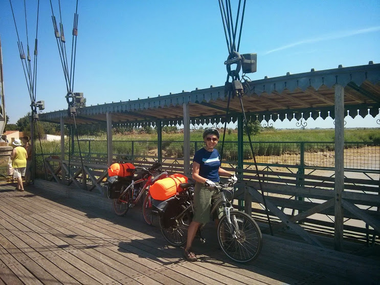 we both awoke with aches and pains and decided on an easier day at a slower pace which seemed to work ok and we survived 38 miles. Funny how 38 miles is now seen as short! But the paths and route were fairly easy though the gpx differed from the signs in Rochfort where a couple of cyclists spoke to us when we checked the map, and they gave us a 3rd option of going via the pont transborder which is a moving platform under a raised bridge. As we’d never been on one we though it’d be fun and it has nothing to do with cutting out a long corner!