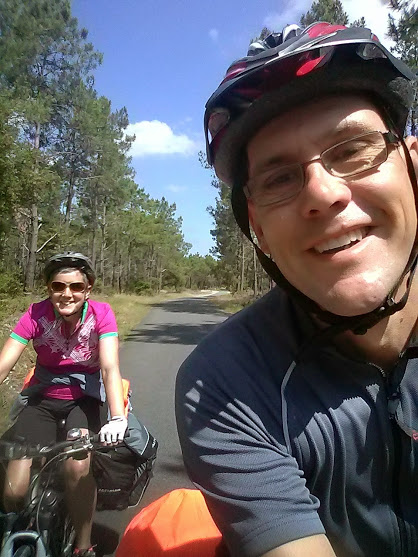 Anyway, after a nice quiet night in a nice campsite in Andernos-les-bains with a friendly English and Irish couple we left for a short 20 mile ride to Salles where we planned to rest our knees and have a day off before the stint to the canals leaving the Atlantic behind. So we pitched up, had a lovely smoked salmon baguette, and then Mel noticed she wasn’t wearing her wedding and engagement ring which must be in the grass at our previous campsite….. Argh!!!!!!