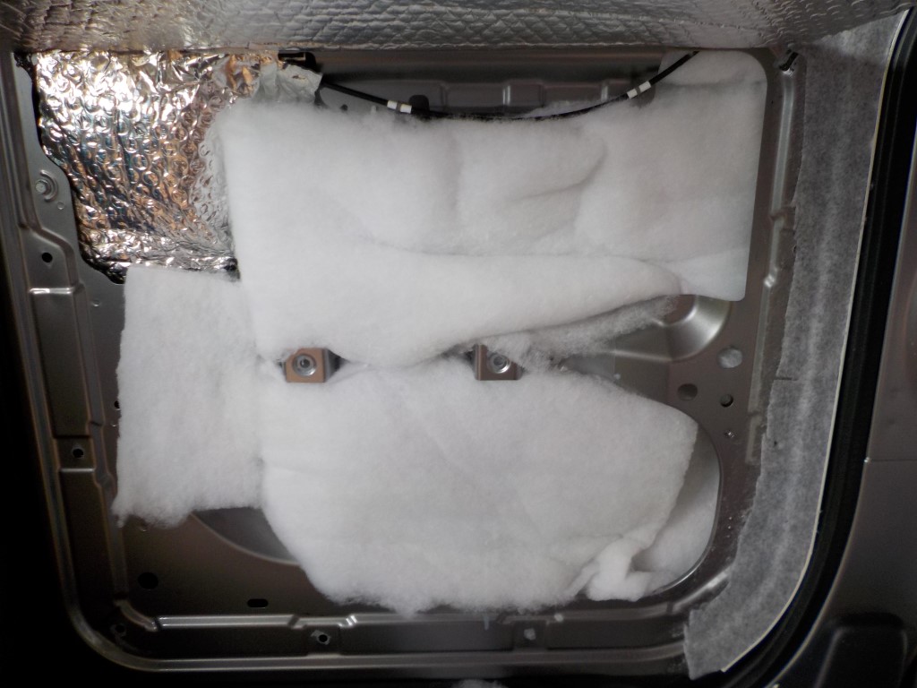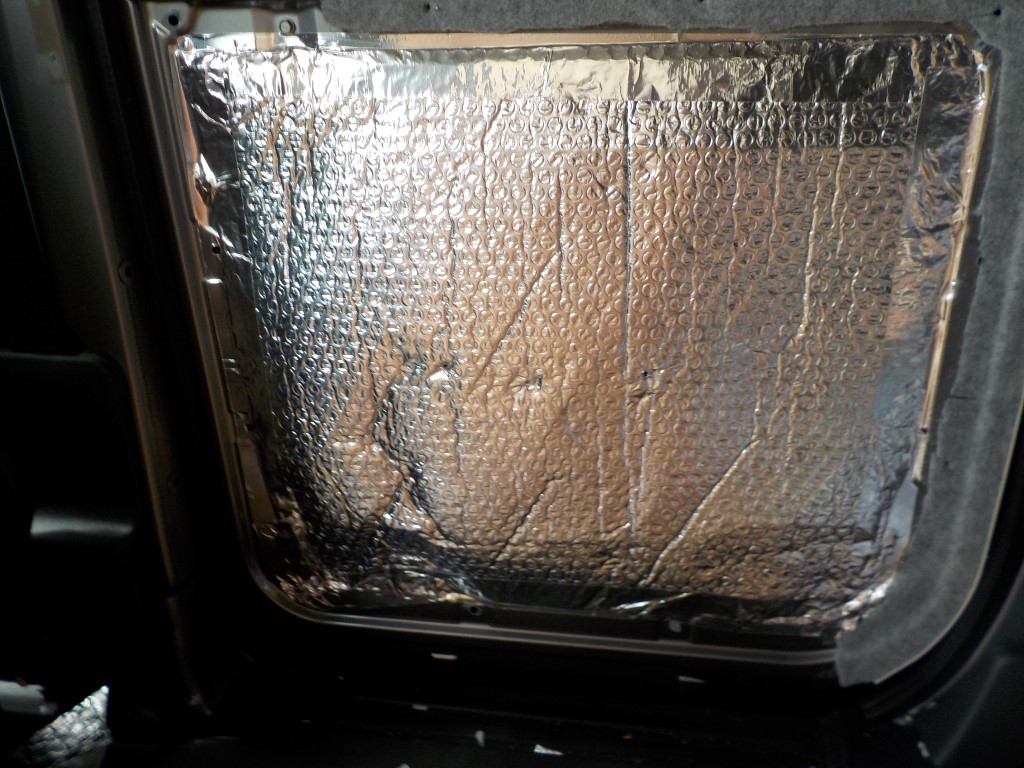 The door was filled with insulation, taking note to leave a water-proof channel next to the handle (silver bubble on LHS) so that any water leaks through the handle would just go to the drain hole and not be stored in the door. Once as much insulation was crammed in and briefly sprayed with glue (not too tight) we then put a full bubble foil insulation over with foil tape as a vapour barrier.