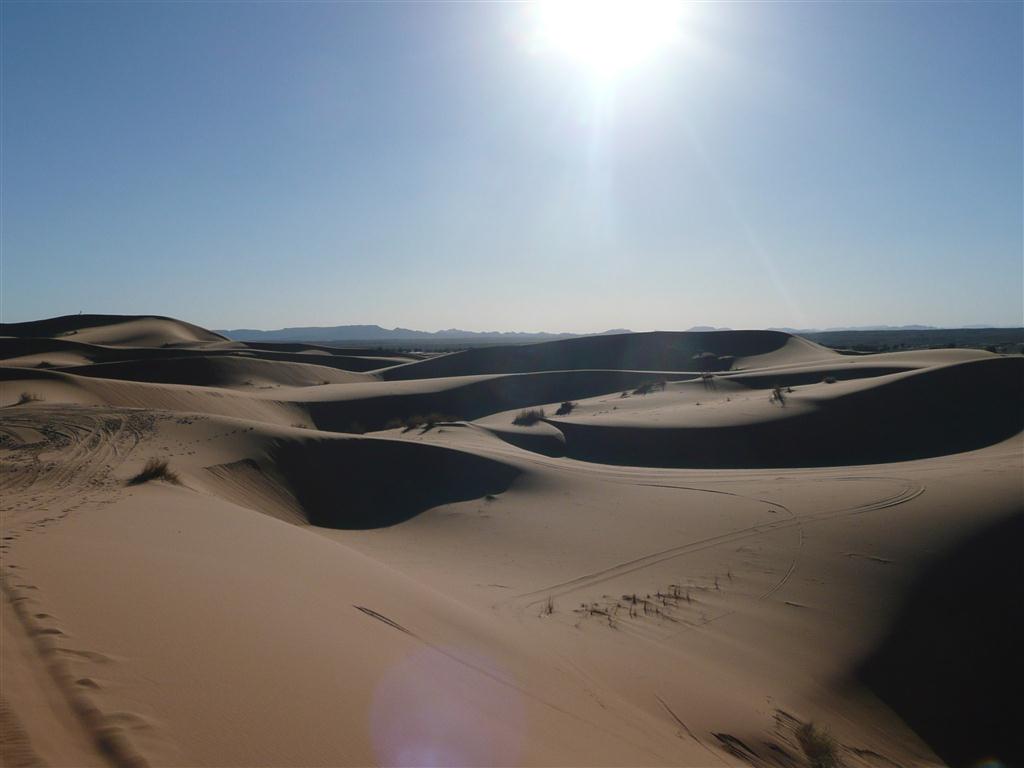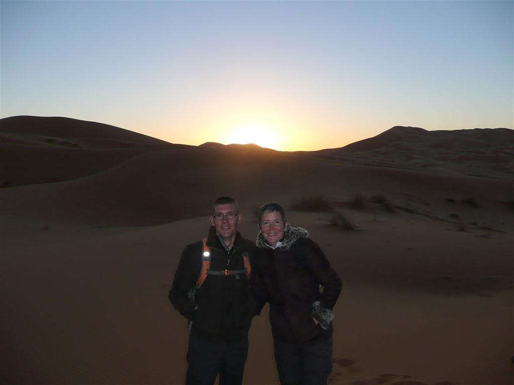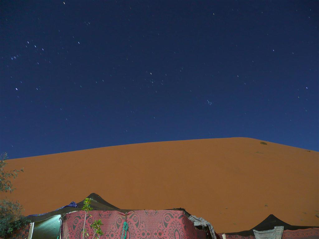 The following day was fairly relaxed until we headed out on camel back into the dunes to a Berber camp as the sun set.  The camp is in a spectacular place appearing as you crest a small dune with a small flat plain and a large dune behind it.  With a truly lovely night with meal and good company, we enjoyed the clear windless skies, full moon and loads of stars with the dune backdrop over a campfire and music.  OK quite touristy, but it was as authentic as it could be, including having to go to the loo “somewhere” in the sand outside!  We all dossed down in the Berber tents for the night until 5:30am when we got up and rode the camels back, stopping only to walk up a dune and watch the sun rise over the Sahara.